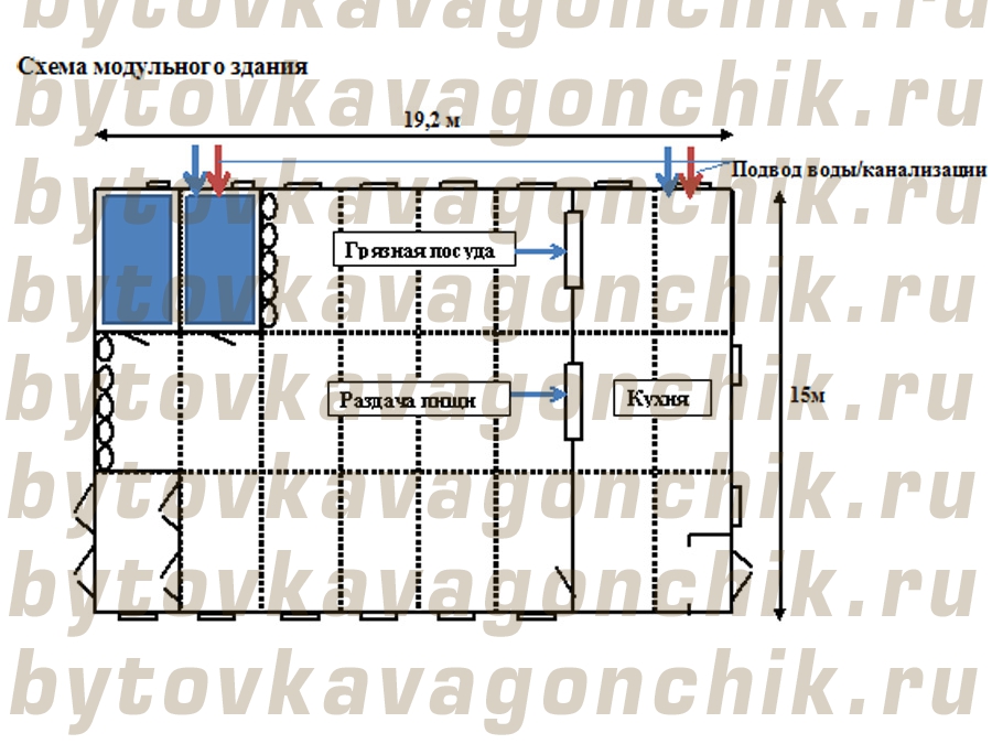 Блок-модуль 19,2*15,0*2,5м (из БК 5*2,4*2,5 – 22шт.) – 1шт.  Столовая/Кухня